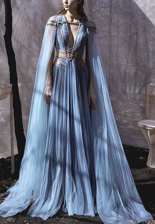 Безумно красивое голубое платье в пол из переливающейся словно драконья чешуя ткани. Совсем нескромный вырез, но не позволяющий разыграться воображению, коричневые тесёмки, опоясывающие талию и располагающиеся в виде ставок на груди, от плеч воздушная накидка, закрывающая руки. Сама юбка легко струилась от талии до пола, не сковывая движения. И поражая меня в самое сердце.