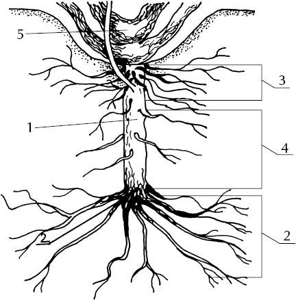 Рис. 1. Строение корневой системы куста винограда: 1 – подземный штамб; 2 – корневая пятка и пяточные корни; 3 – росяные корни; 4 – срединные корни; 5 – голова