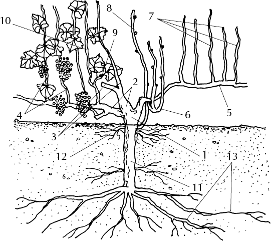 Рис. 2. Общее строение виноградного куста: 1 – голова куста; 2 – рукава; 3 – плодовое звено; 4 – плодоносные побеги; 5 – стрелка плодоношения; 6 – сучок замещения; 7 – однолетние побеги или лоза; 8 – порослевый побег; 9 – пасынок; 10 – бесплодный побег; 11 – подземный штамб; 12 – росяные корни; 13 – корневая система