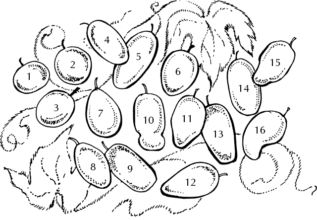 Рис. 10. Виды виноградных ягод по форме: 1 – сплюснутая; 2 – округлая; 3 – овальная; 4 – продолговатая; 5 – длинная; 6 – яйцевидная; 7 – обратнояйцевидная; 8 – с выпуклыми сторонами; 9 – цилиндрическая; 10 – с перехватом; 11 – сосковидная; 12 – заостренная; 13 – притупленная; 14 – пальцевидная; 15 – слабо изогнутая; 16 – сильно изогнутая