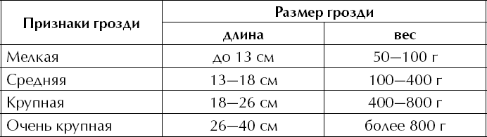 Виноградная гроздь формируется из соцветия, части которого преобразуются в элементы грозди, а именно: ножка соцветия – в ножку грозди (с ее помощью гроздь прикрепляется к побегу), ось соцветия вместе с разветвлениями – в гребень, завязи – в ягоды. Величина и масса грозди определяются сортом и условиями, в которых она закладывается (табл. 2).