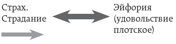 Если происходит застревание, т. е. отсутствует борьба, то базовые стимулы к движению, заложенные природой, запускают программу самоуничтожения. Происходит короткое замыкание, и выработка энергии меняется на обратный потенциал. Энергия не выходит из нас, а блокируется внутри, в мышцах, формируя спазмы и вызывая низкие вибрации. Т. е. понятные стимулы, которые должны были подтолкнуть нас к движению, выработке энергии, направленной вовне, и повышению нашего энергетического уровня (рис. 1), становятся настоящими убийцами. Они уничтожают сначала накопленный энергетический уровень, если он есть, а далее вызывают болезни и смерть в характерный смертельно опасный период 25–27 лет, который губит тех, кто не идет вслед за настройками природы. Отсутствие борьбы со страхом, апатия, рабское мировоззрение вызывают выработку одного из видов энергии обратной полярности (рис. 2), и безотказное следование за зависимостями и страстным влиянием удовольствий – другое крайнее состояние выработки энергии обратной полярности (рис. 3).