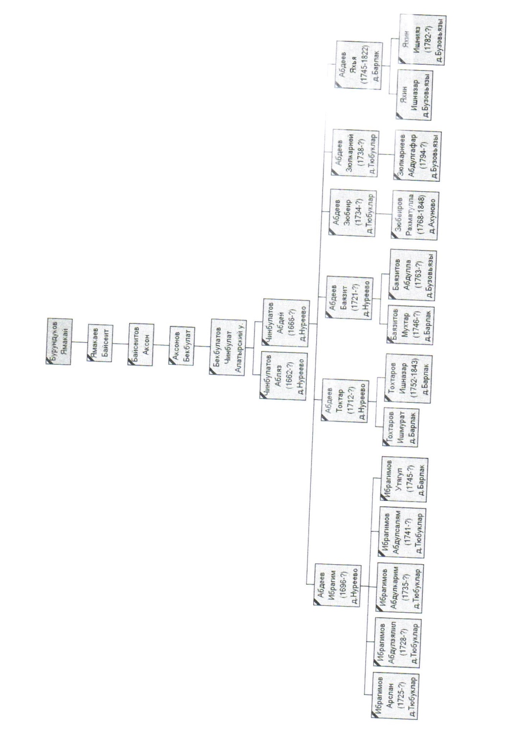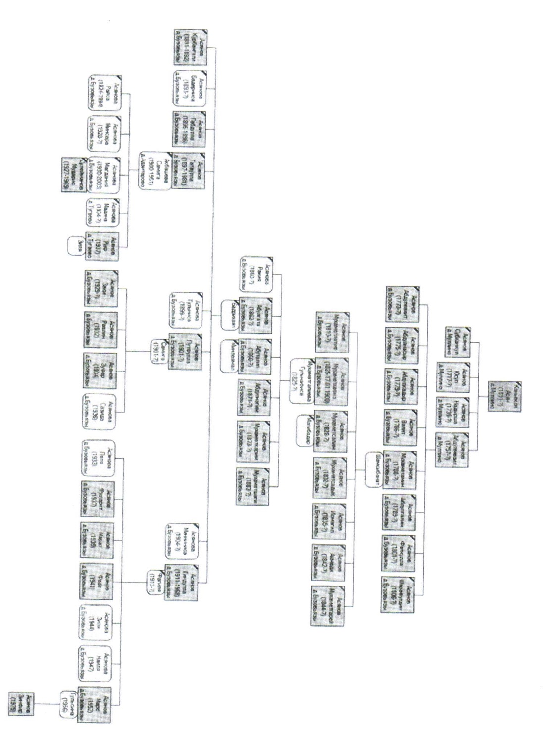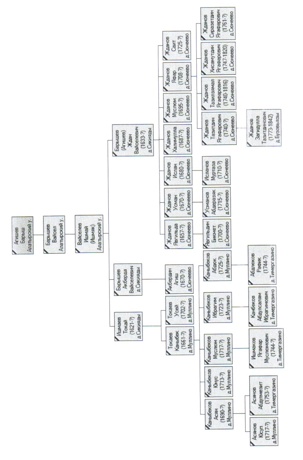 Приведём также продолжение родословной таблицы рода Агишевых в лице их потомков Асяновых. Фамилия берет начало от имени служилого мещеряка Асяна Каныбекова. В конце 1750-х годов представители рода Асяновых обосновались в деревне Бузовьязы.