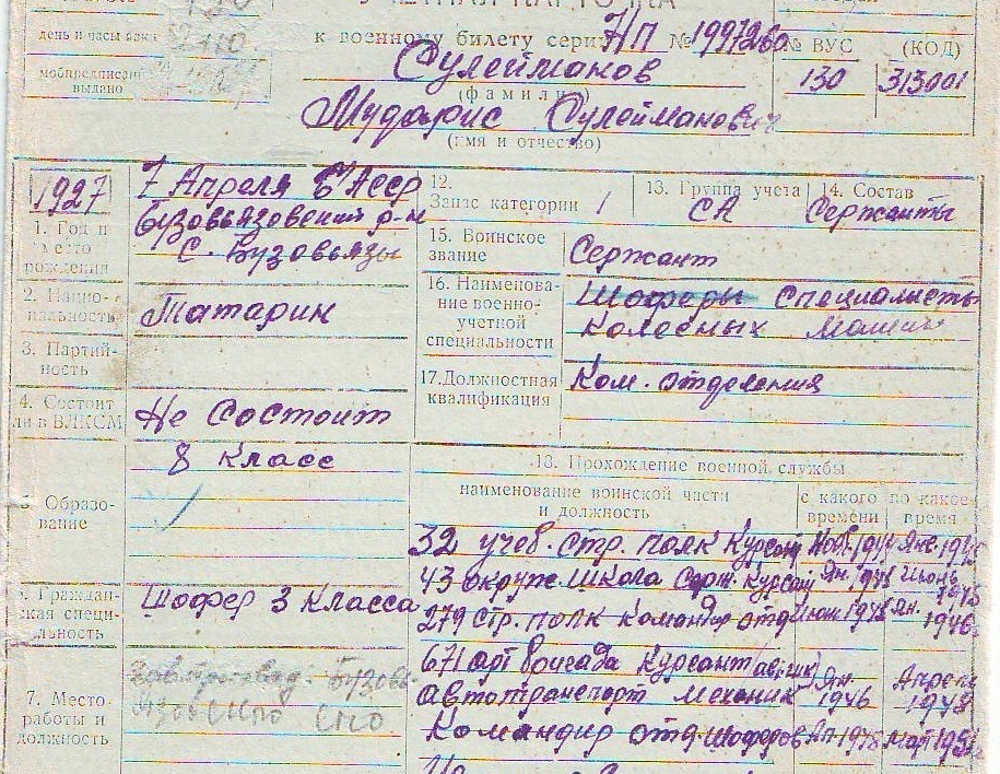 После взятия Берлина и капитуляции фашистской Германии мир наступил еще не скоро. В августе 1945 года Советский Союз, согласно союзническим обязательствам перед странами – союзниками по антифашистскому блоку, вступил в войну с Японией, оккупировавшей до того большую часть Китая. Многие советские соединения были на эшелонах направлены из Восточной Европы на Восток. В этих боях на Дальнем Востоке в составе 91-й стрелковой дивизии (командир – генерал-лейтенант В.И. Кожанов), входившей в состав 39-й армии Забайкалского фронта принимал участие и командир отделения 279-го стрелкового полка (командир – Г.Н. Лехман) Сулейманов Мударис Сулейманович. Демобилизовался он только в 1951 году.