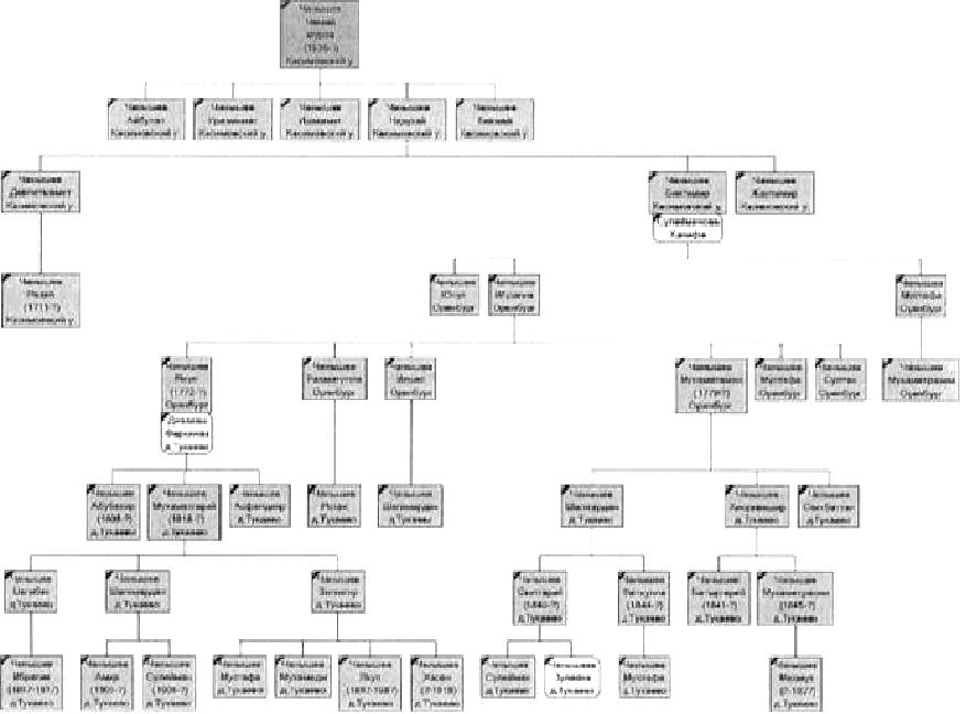 Существуют две версии начальной части родословной Чанышевых. По первой из них, князь Темген является сыном Чаныша92, а по другой родословной, которая хранится в РГАДА Чаныш является сыном Темгена93. Мы придерживаемся второй, документально подтвержденной версии. По народным преданиям, князь Чаныш является выходцем из Крыма94. Казанский историк д. М. Исхаков связывает князя Чаныша с главой клана Аргынов в Касимовском ханстве князем Чеш (Джаниш) беком, принимавшем участие в возведении на касимовский престол хана Ураз-Мухаммеда в 1600 году95. В этой связи необходимо отметить, что клан Аргынов отмечен также в Крымском ханстве.