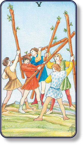 Замечено: выпадение данного аркана во многих случаях предупреждает о напряжении в ситуации и возможном возникновении разногласий и споров. Но если рядом есть арканы, на которых персонажи отвернуты от 5 Жезлов, то это может говорить о том, что человек не желает присоединяться к другим ни при каких обстоятельствах и не вступит в конкурентную борьбу.