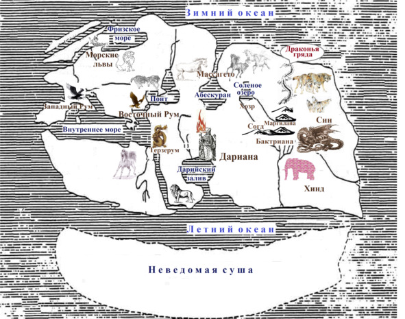 Так закончилась первая звериная битва, и так Земля распростерлась по всей суше. В тех местах, где обосновались бывшие обитатели сада, возникли со временем государства. На северо-западном берегу Внутреннего моря образовался Рум, на северо-восточном – его придаток Восточная Румийская империя. На берегах северного моря установилось королевство Северных Львов, которые сами себя называли «морскими». На южной равнине не возникло никакой державы, но там вольными прайдами стали хозяйничать потомки первых львов. Восточнее изначальной Земли укрепилась Дариана, и ей подчинялись четыре других государства: Согд, Бактриана, Хозр и Маргилана. Южнее последних, за неприступными кряжами Крыши Мира руками отважных первопроходцев был воздвигнут Хинд. В степях севернее Абескурана и на берегах Соленного озера образовалась конфедерация кочевых племен Массагето, что в переводе с языка кочевников означает «от семени коня». На восток от них укрепились сарматы (те же лошадники), а еще восточнее, за Драконьей грядой – северные волки. К югу от них правили волки Малой стаи. Последним удалось подчинить своей власти племена фаунов, что в переводе означает «потомки дракона», и создать свою державу – Син. А на месте изначальной Земли возникло маленькое княжество Терзерум – «Земля обета». Просуществовав недолго, оно досталось сначала Западному Руму, позже – Дариане, а в конце – Восточным руминам.