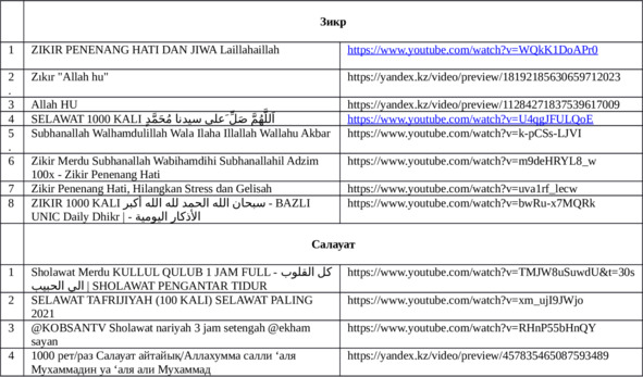 Здесь уместно сказать, если вы работайте за компьютером то можно поставить их с копировав эти ссылки, которые написанный внизу в таблице №1 и поставить их себе на компьютер или смартфон (можно в наушниках), ниже написанные зикры, и негромко прослушивать их, также можно на ночь когда засыпаете поставить не громко и уснуть (через смартфон, а если вы ком-то мешайте, можно в наушниках). Либо на улице когда куда-то вы идете. Либо посветить один час своего времи или два часа где нибудь на работе через наушники. А в целом более правильно это выделить 30 минут или 1 час, или два часа своего времени например ночью или утром, либо когда вам удобно уединившись в комнате поставить проигрыватель (обратите внимание на sound bar от фирмы Sony, подробнее https://sonycenter.kz/saundbary1) и повторять языком зикры, при этом ум должен с фокусирован на зикре (ПРЕДУПРЕЖДЕНИЕ когда вы едите за релем автомобиля, эту практику не делать, из-за безопасности на дороге):