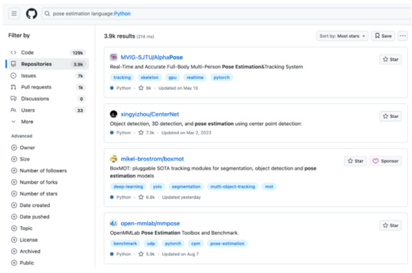 Let’s run the search query on GitHub2 for “pose estimation”, specify on Python and sort repositories by most stars: