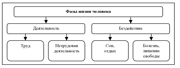 В течение жизни человека, в каждый ее момент он находится в одном из двух состояний – деятельности или бездействия. На рис. 2 представлены фазы жизни человека.