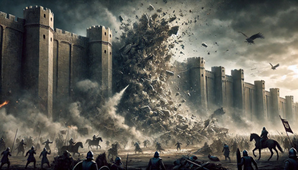 Ожидание не продлилось долго. Вскоре брюхо и горло зверя начали светиться и пульсировать тёмно-фиолетовым светом. Чудовище, встав на задние лапы, раскрыло пасть. Когда раздался звук искрящегося заряда, зверь поднял голову вверх, а затем с яростью выпустил поток энергии в сторону ворот. Огромная фиолетовая молния, похожая на гигантский луч, пронзила пространство, и через мгновение послышался оглушительный грохот. Ворота крепости были разрушены – образовалась дыра диаметром в пятьдесят метров.