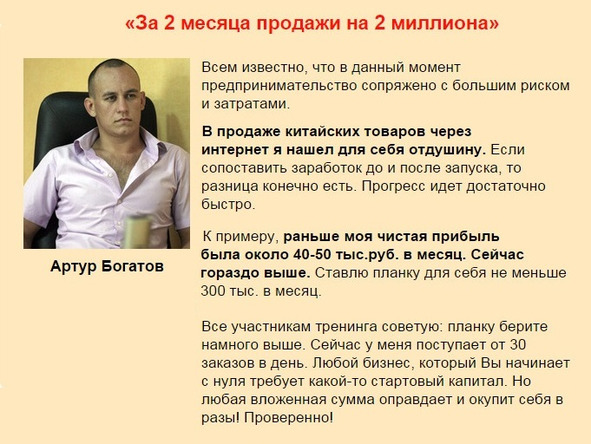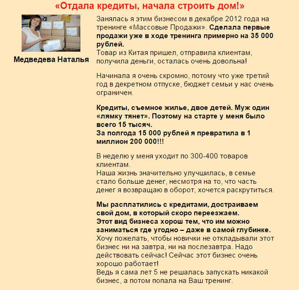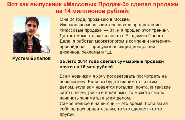 Деваться было некуда, тем более что это еще один дополнительный источник заработка – мы решили сделать тренинг «Массовые продажи физических товаров 1» в конце 2012 года. Записалось на тренинг БОЛЬШЕ 300 ЧЕЛОВЕК в первый поток! Мы умудрились на самом тренинге заработать больше 2 миллионов рублей. Это был настоящий взрыв – мы провели тренинг, который разорвал к чертям рынок продаж физических товаров. Наши ученики находили новые товары и начали массово продавать их на десятки, сотни тысяч рублей. После первого потока тренинга нам пришло больше 80 восторженных отзывов! Мы поняли, что попали в самую точку. Нашли способ показать каждому человеку, как зарабатывать хорошие деньги в интернете без знаний, опыта, технических навыков. И тут образовался наш проект «Академия Своего Дела».