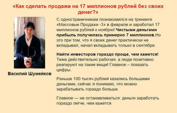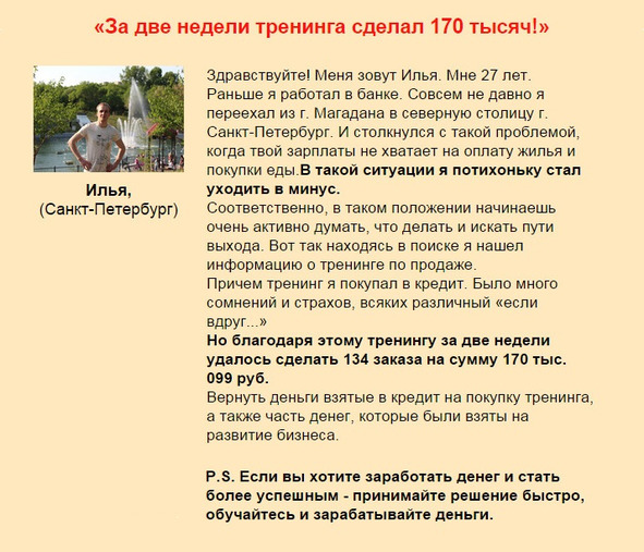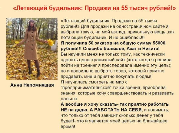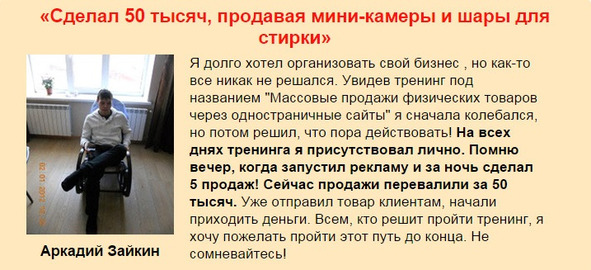 Это только начало – мы создали и развили новый рынок. Рынок продаж физических товаров через одностраничные сайты. Сейчас есть люди, которые зарабатывают 1 миллион рублей чистыми за два месяца! Раньше в такое сложно было поверить, а теперь это норма. Следующая планка для нас и наших учеников – это миллион долларов. А потом – миллиард рублей. Если вы тоже хотите отхватить свой кусочек рынка и начать зарабатывать на продаже физических товаров, я приглашаю вас в наше сообщество.