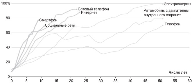 Другими словами, технологии – и особенно цифровые – распространяются быстрее, чем что-либо прежде. И этот процесс постоянно ускоряется. Жизнь в эпоху закона Мура определяется экспоненциальным распространением технологий.