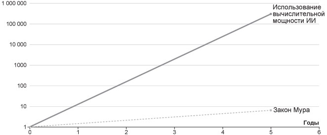 Однако если новый подход к вычислениям – искусственный интеллект, то каковы необходимые ему мощности? С 2012 по 2018 год компьютерная мощность, используемая для обучения крупнейших моделей ИИ, росла примерно в шесть раз быстрее, чем темпы, о которых говорилось в законе Мура. На графике ниже показан рост вычислительных операций, используемых в современных системах ИИ, на фоне экспоненциальной кривой закона Мура за тот же период. Если бы использование вычислительных мощностей ИИ следовало кривой закона Мура, то за шесть лет оно бы выросло примерно в семь раз. На деле же оно увеличилось в триста тысяч раз[38].