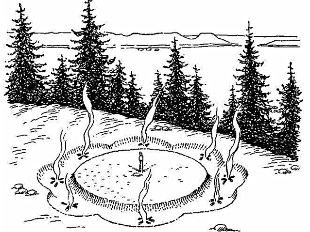 «Утомленная зрелищем бессмысленного прозябания мира, – писал Е. Трубецкой, – душа хочет радоваться о человеке. Однако оказывается, что и человек повторяет в своей жизни низшее из всего низкого, что есть на свете, бессмысленное вращение мертвого вещества, прозябание растения и все отталкивающее, что есть в мире животном. Он точно так же суетится, добывает пищу и поедает ее, нередко являя собою воплощенное отрицание всего святого и в заключение умирает». И поэтому только с разрывом этого круга связывались надежды на дальнейшее развитие человека и общества. Идея вечного возвращения графически выражается кругом, который ложился в основу представлений славян (и вообще язычников) об окружающем мире и прежде всего воплощался в форме святилищ, капищ, курганов – модели мира. Поскольку язычество было религией природы, капище не подразумевало стен и тем более крыши – оно должно было быть раскрытым навстречу природе.