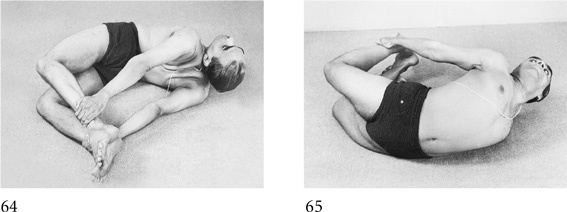3. На вдохе вернитесь в Дханурасану (фото 63). С выдохом перекатитесь на левый бок (фото 65).