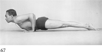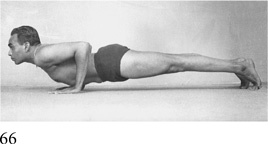 3. С выдохом оторвите все тело на несколько сантиметров от пола. Балансируйте на ладонях и пальцах ног (фото 66). Тело должно быть крепким, как палка, и выравниваться параллельно полу по всей длине от головы до пяток. Подтягивайте колени. Оставайтесь в этом положении в течение некоторого времени. Дышите в нормальном ритме.