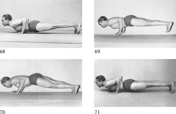 4. Сделайте несколько вдохов. На очередном выдохе оторвите руки и ноги от пола и прыгните всем телом вперед примерно на 30 см (фото 69, 70 и 71). Сделайте несколько вдохов, а затем с выдохом сделайте еще один выпад.