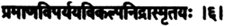 Wrong perceptions (viparyaya) are gathered by the senses of perception and influence the mind to accept what is felt by them (as in the story of the six blind men and the elephant). Fanciful knowledge (vikalpa) causes the mind to live in an imaginary state without consideration of the facts. Memory (smrti) helps one to recollect experiences for right understanding. Sleep (nidra) has its own peculiarity. As a jar when empty is filled with air, so consciousness is empty in sleep. It exists in space, without a place, and is filled with dormancy. In sleep, one has a glimpse of a quiet state of mind, manolaya. This dormant state of mind is felt only on waking. Just as a flower when at rest is in its bud, so the consciousness rests in its bud, the conscience. Correct knowledge (pramana) is direct knowledge from the core of the being. It is intuitive, therefore pure, and beyond the field of intellect.
