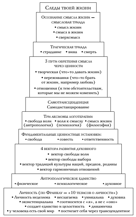 Франкл – основатель Третьей венской школы психотерапии. Она носит название логотерапия (от греческого «логос» – слово, смысл), и в русском переводе точнее всего может быть названа «смыслотерапия». Антропология Франкла ведет свои истоки из классической философии (Платон, Аристотель), из экзистенциальной философии (Шелер, Ясперс, Гуссерль, Хайдеггер, Бубер). Человеческая личность трехмерна, ее составляющие – физическая, психическая (в горизонтальной плоскости) и духовная (вертикаль).