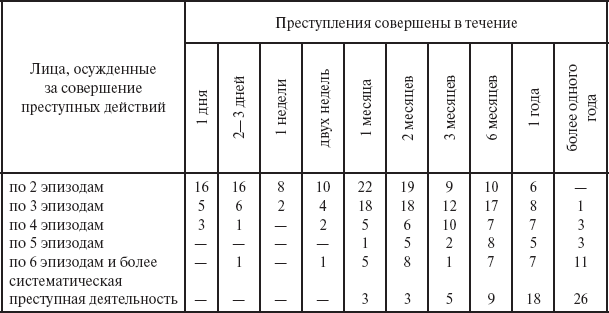 По изученным нами материалам 116 человек осуждены за совершение аналогичных преступлений по двум эпизодам, 91 человек – по трем эпизодам, 44 человека – по четырем эпизодам, 24 человека – по пяти эпизодам, 41 человек – по шести эпизодам и более и, наконец, 64 человека осуждены за систематическую преступную деятельность. Эти преступные действия были совершены в следующие сроки: