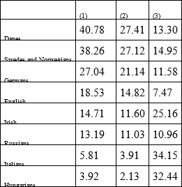 The economic as well as the social importance of the tendency of the Scandinavian immigrants to settle upon the unoccupied farm lands of the West, can scarcely be over-emphasized. It gains still more striking significance when the figures showing such settlement are compared with those of some other races which have more recently contributed largely to the immigrant population; for the man who owns and develops a farm necessarily makes a permanent, long-time investment of himself and his family in a reproductively extractive industry; while the wage-earner in the mines or in lumbering is quite likely to be a “bird of passage,” engaged in destructively extractive industries, with only vague notions of, or longings for, citizenship and its responsibilities. Professor John R. Commons, perhaps the best statistical authority on this subject, gives some striking figures illustrative of the farm-ward tendencies of different alien elements, showing the percentage of total number of males in 1890 engaged (1) on farms, (2) as farmers and planters, and (3) as laborers not specified:230
