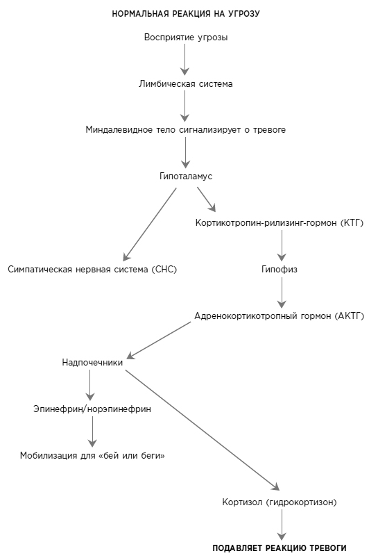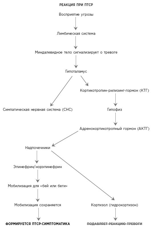 Лимбическая система реагирует на экстремальную травматическую угрозу, выделяя гормоны, которые приказывают организму подготовиться к защитным действиям (см. рис. 1.1, с. 31). После восприятия угрозы миндалевидное тело подает сигнал тревоги гипоталамусу (оба входят в структуру лимбической системы), который, в свою очередь, активирует две системы: (1) СНС и (2) высвобождение кортикотропин-рилизинг-гормона (КРГ). Эти две системы продолжают действовать, каждая самостоятельно, но подчиненные единой задаче. СНС активирует надпочечники для высвобождения адреналина и норадреналина, необходимые для мобилизации организма для борьбы или бегства. Дыхание и частота сердечных сокращений учащаются, что должно увеличить количество кислорода в крови, при этом кровь перенаправляется от кожи к мышцам для обеспечения быстроты движения. (В случае Чарли учащенное дыхание и приток крови к ногам позволили ему крутить педали быстрее и проехать дальше, чем обычно.) В это же время другая система, КРГ, активирует шишковидную железу для высвобождения адренокортикотропного гормона (АКТГ), который также активирует надпочечники, на этот раз для высвобождения гидрокортизона (кортизола). Как только травматический инцидент закончится и/или борьба или бегство будут успешно совершены и завершены, кортизол остановит экстренные реакции и выработку адреналина/норадреналина, помогая восстановить гомеостаз организма.
