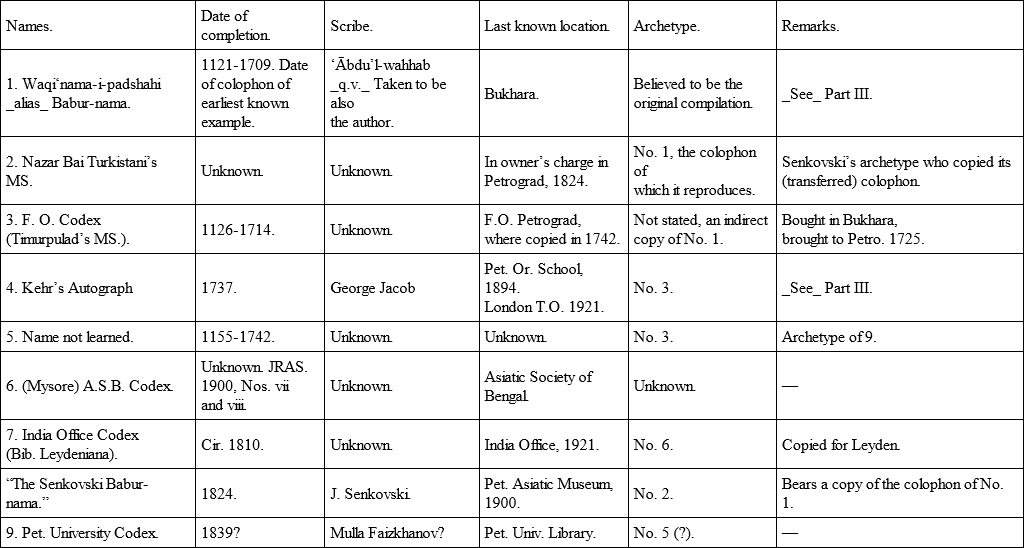 I take with gratitude the long-delayed opportunity of finishing my book to express the obligation I feel to the Council of the Royal Asiatic Society for allowing me to record in the Journal my Notes on the Turki Codices of the Babur-nama begun in 1900 and occasionally appearing till 1921. In minor convenience of work, to be able to gather those progressive notes together and review them, has been of value to me in noticeable matters, two of which are the finding and multiplying of the Haidarabad Codex, and the definite clearance of the confusion which had made the Bukhara (reputed) Babur-nama be mistaken for a reproduction of Babur’s true text.