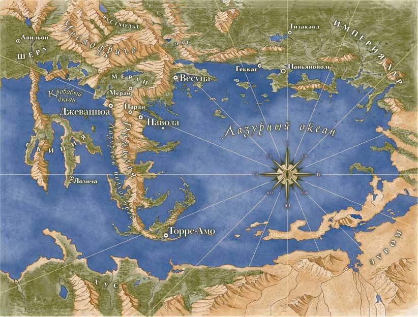 В чем можно было удостовериться, так это в том, что глаз обнаружили в гробнице могущественного правителя – не уточняя, было ли это научным открытием или откровенным грабежом, – но в любом случае цепочка событий доставила находку в караван торговца, который проследовал по торговым путям через ледяные перевалы Хим и Харат, по белопенным волнам Лазурного океана в наш прекрасный город Наволу, бьющееся сердце банка мерканта[1] всех земель, что говорили на амонских диалектах, и наконец глаз попал к моему отцу, Девоначи ди Регулаи, который славился своим богатством и влиянием на побережье Лазури.