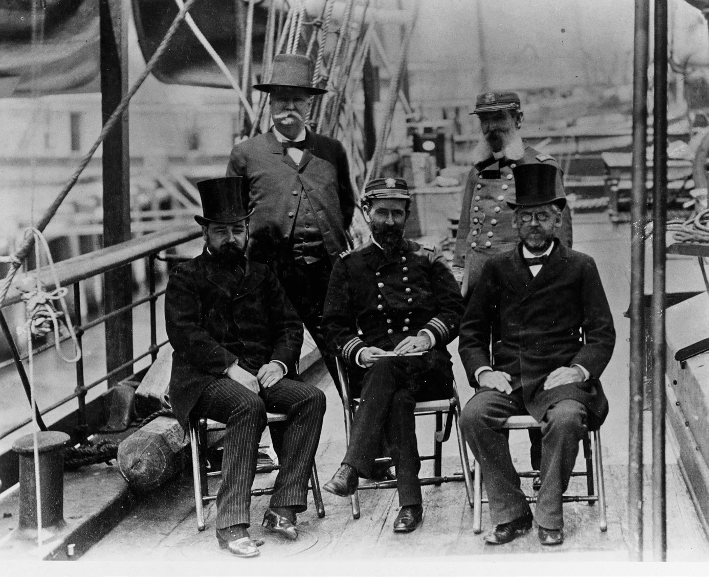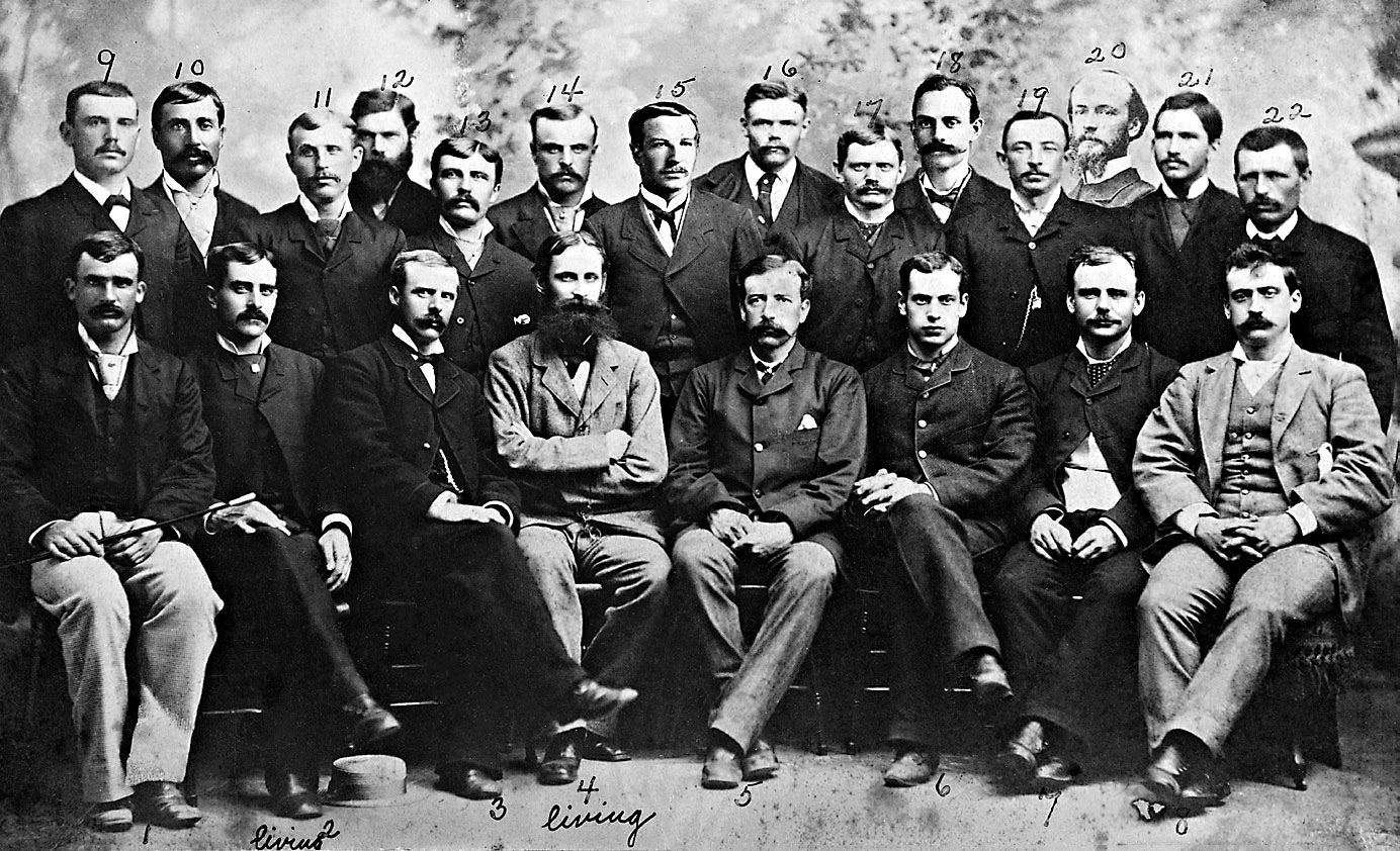 В первом ряду слева направо: Морис Коннелл; Дэвид Л. Брэйнард; Фредерик Ф. Кислингбери; Адольф В. Грили; Джеймс Б. Локвуд, Эдвард Израэль; Уинфилд С. Джуэлл; Джордж У. Райс. Во втором ряду слева направо: Уильям Уислер; Уильям Э. Эллис; Джейкоб Бендер; Уильям Хол. Кросс; Джулиус Фредерик; Дэвид Линн; Генри Бидербик (санитар); Чарльз Б. Генри; Фрэнсис Лонг; Дэвид К. Ралстон; Николас Салор; Октав Пави (врач)[1]; Хэмпден С. Гардинер; Джозеф Элисон (Фото: G. W. Rice / Фото из архива Командования историческим наследием ВМС США / Courtesy of Naval History and Heritage Command)