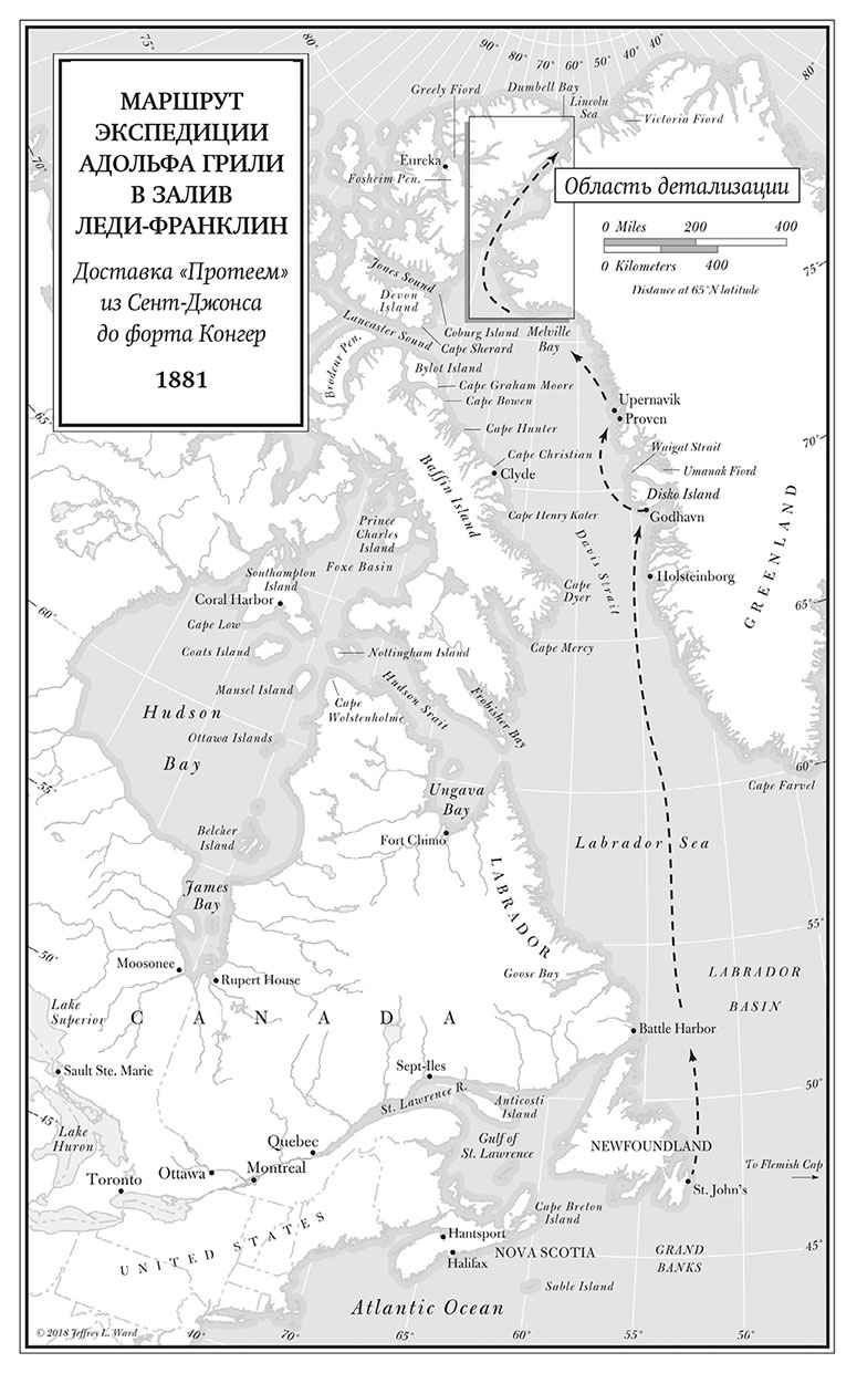 «Протей», спущенный на воду и получивший своё имя в 1874 году в шотландском Данди, был 467-тонным пароходом с железным форштевнем, спроектированным под плавание в высоких широтах для промысла тюленей. Ресурс этого судна при правильном уходе был рассчитан на полвека. Командовал «Протеем» капитан Ричард Пайк, один из опытнейших полярных мореплавателей Ньюфаундленда. Теперь Пайк шёл курсом на север с невероятной для этого времени года скоростью, рассекая в густом тумане неспокойные и забитые льдом воды пролива Дэвиса, пока не достиг западных берегов Гренландии. Там они бросили якорь на рейде Годхавна (современный Керкертасуак) на острове Диско. Сквозь поднимающийся туман перед взорами Грили и его людей проступили прибрежные горы высотой под 3000 футов, а под ними – датское поселение вокруг закрытой тихой бухты. Местные приветствовали прибытие «Протея» пушечным залпом, и вскоре на борт к ним поднялся лично Софус Краруп-Смит, инспектор Датского королевства по Северной Гренландии.