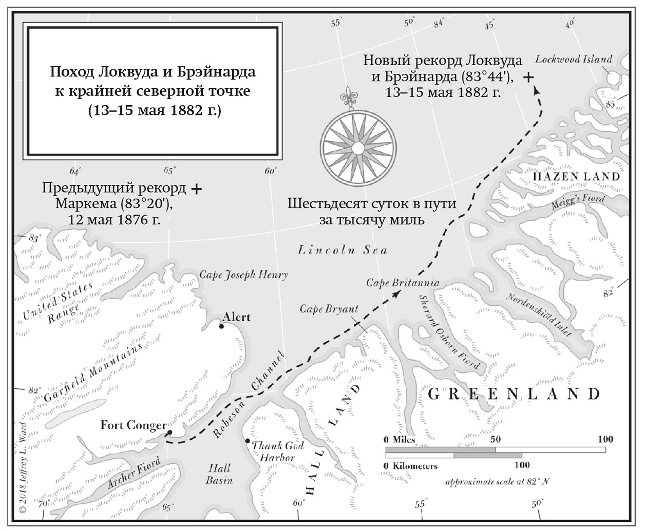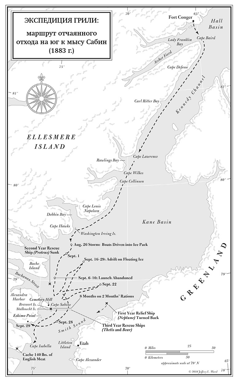 Экспедиция прошла через череду неимоверных испытаний. За 200 морских миль к северу на их пути одна за другой вставали все мыслимые и немыслимые трудности, препоны и опасности: нападения волков; ураганной силы ледяные ветра; 70-градусные морозы и сводящая с ума беспросветная тьма полярной ночи длиною в месяцы. Следуя приказу, тремя неделями ранее Грили вывел своих людей из относительной безопасности форта Конгер – построенной и обжитой ими зимовки над губой на северо-восточной оконечности острова Элсмир. Оставив отапливаемый углем форт с плитой и камином, стенами и крышей, а главное – с запасом провианта на целый год, – они погрузились в лодки и отчалили на юг, к мысу Сабин, через забитый льдами морской пролив[3]. Пробиваться сквозь бурлящее месиво шуги между массивными льдинами под покровом туманов и вьюг при угасающем свете осеннего солнца было предательски сложно. И, хотя сам Грили это признавать отказывался, близорукость делала его в такой ситуации никудышным шкипером. Для навигации в сумерках среди полярных льдов нужна была пара куда более зорких глаз, чем у Грили.