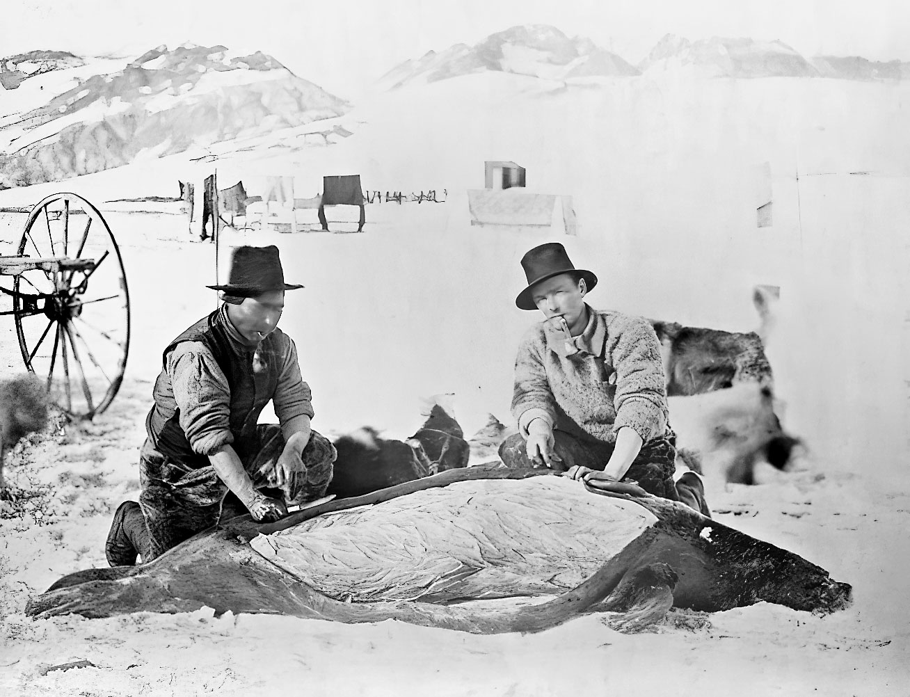 Доктор Октав Пави и гренландец Йенс снимают шкуру с добытого тюленя (фото Дж. У. Райса