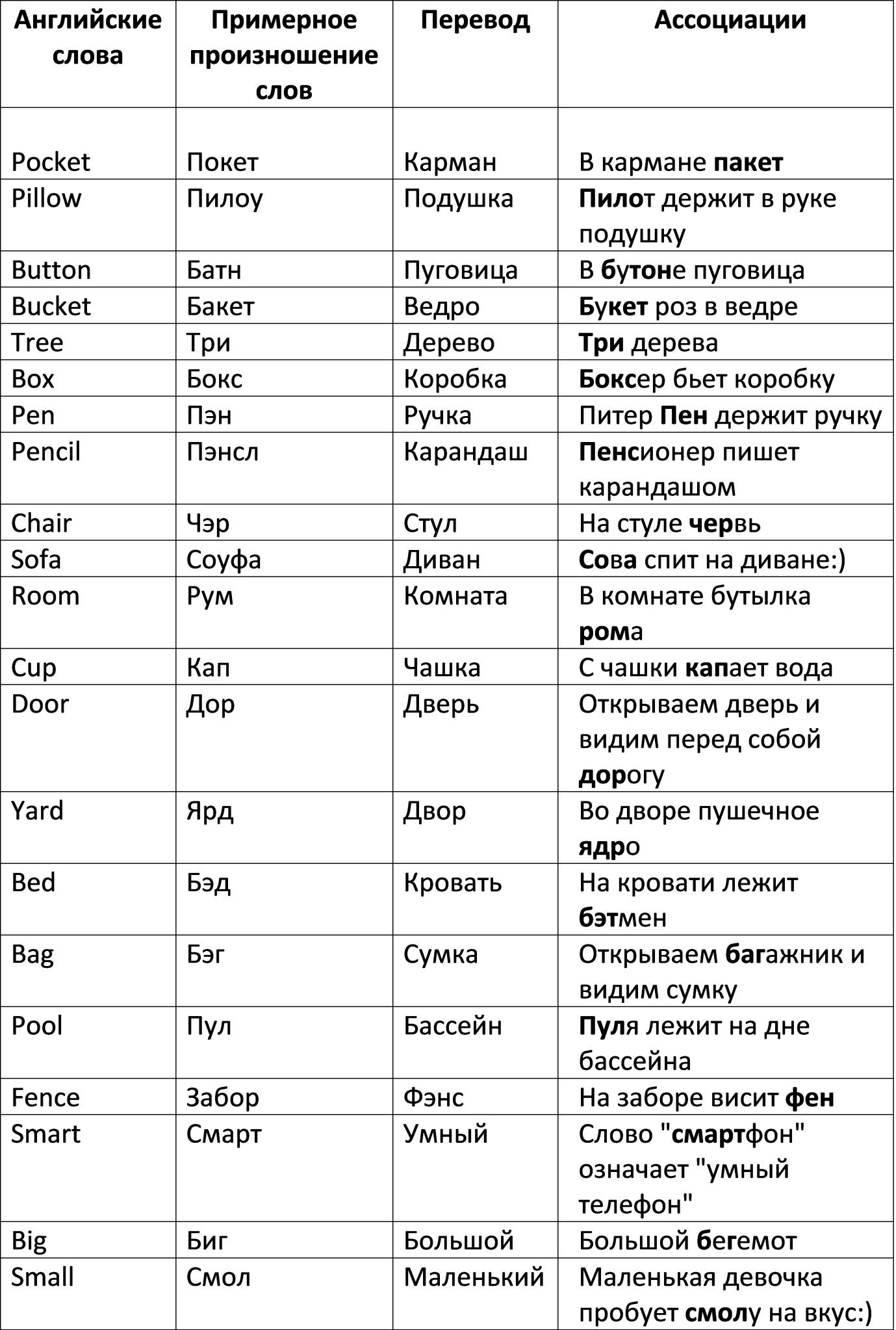 Перед тем, как перейти к первому уроку, необходимо выучить все слова, указанные в таблице ниже. Для облегчения запоминания новых слов следует использовать ассоциации, предложенные в последней колонке таблицы. Рассмотрим на примере, как именно нужно запоминать слова при помощи ассоциаций.