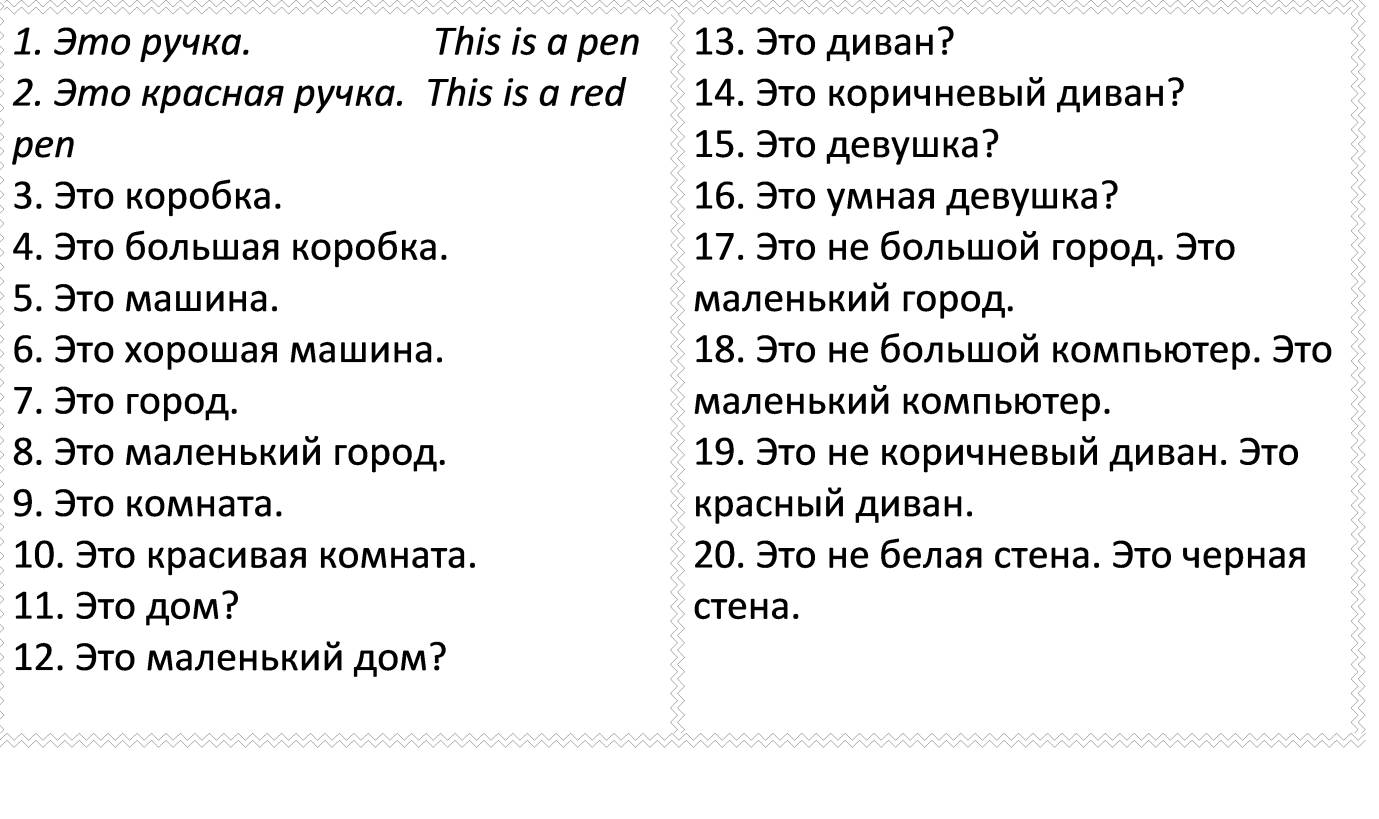 Прикройте правую колонку рукой и начните переводить фразы из первой колонки в медленном темпе. В случае неуверенности подсматривайте перевод фраз из правой колонки. Как только дойдете до конца таблицы, вернитесь к самому началу и начните заново переводить те же самые фразы, но уже в ускоренном темпе.