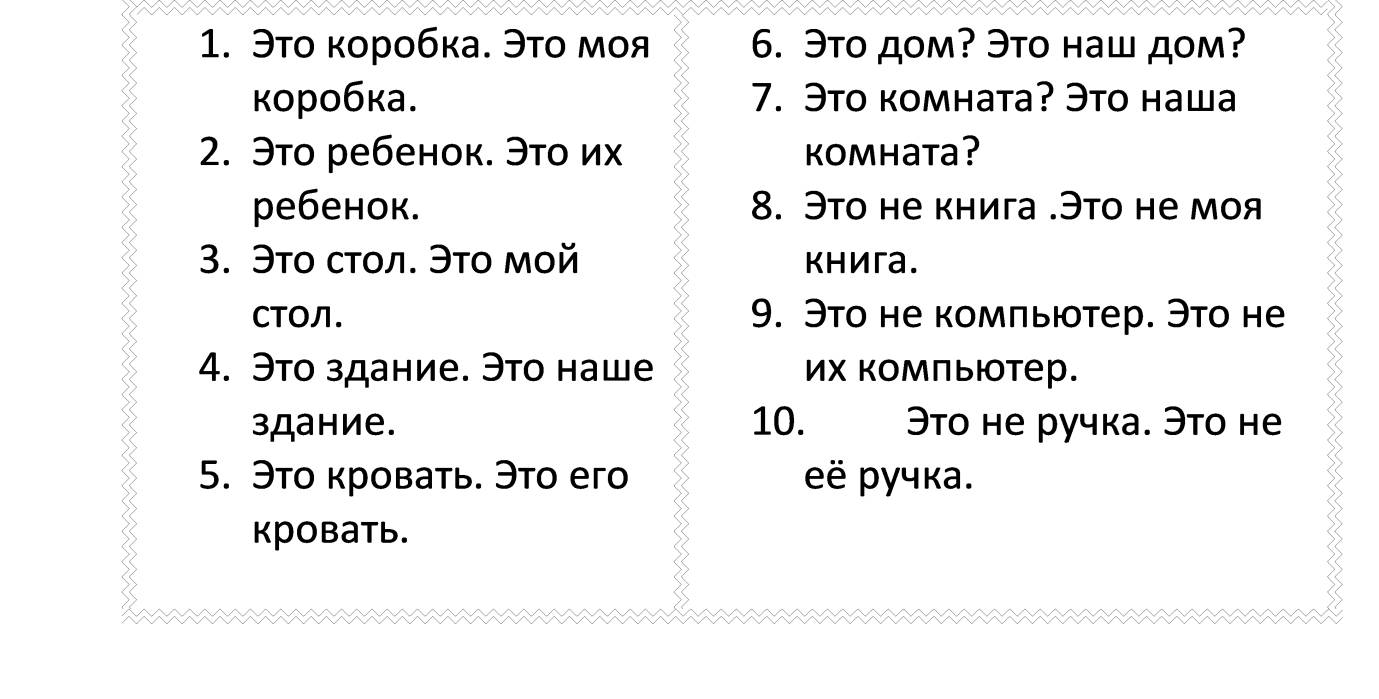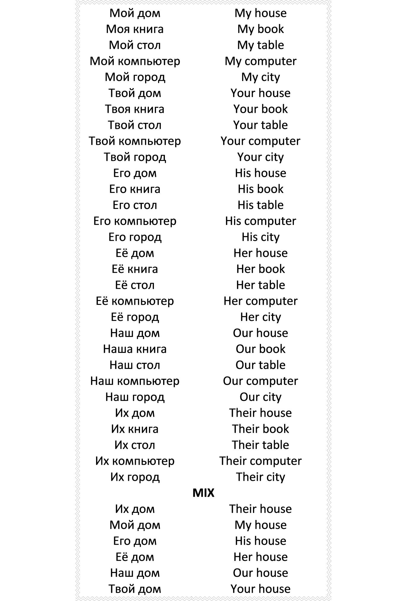 Чтобы выучить притяжательные местоимения, переведите словосочетания из первой колонки таблицы.