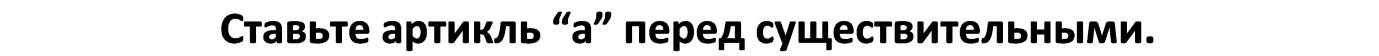 !!!Есть исключения, когда артикль не ставится. Мы их обязательно изучим досконально. А пока ставьте "а" перед любым существительным во всех предстоящих упражнениях этого урока, пока вы не будете готовы к дополнительной информации об артиклях!!!