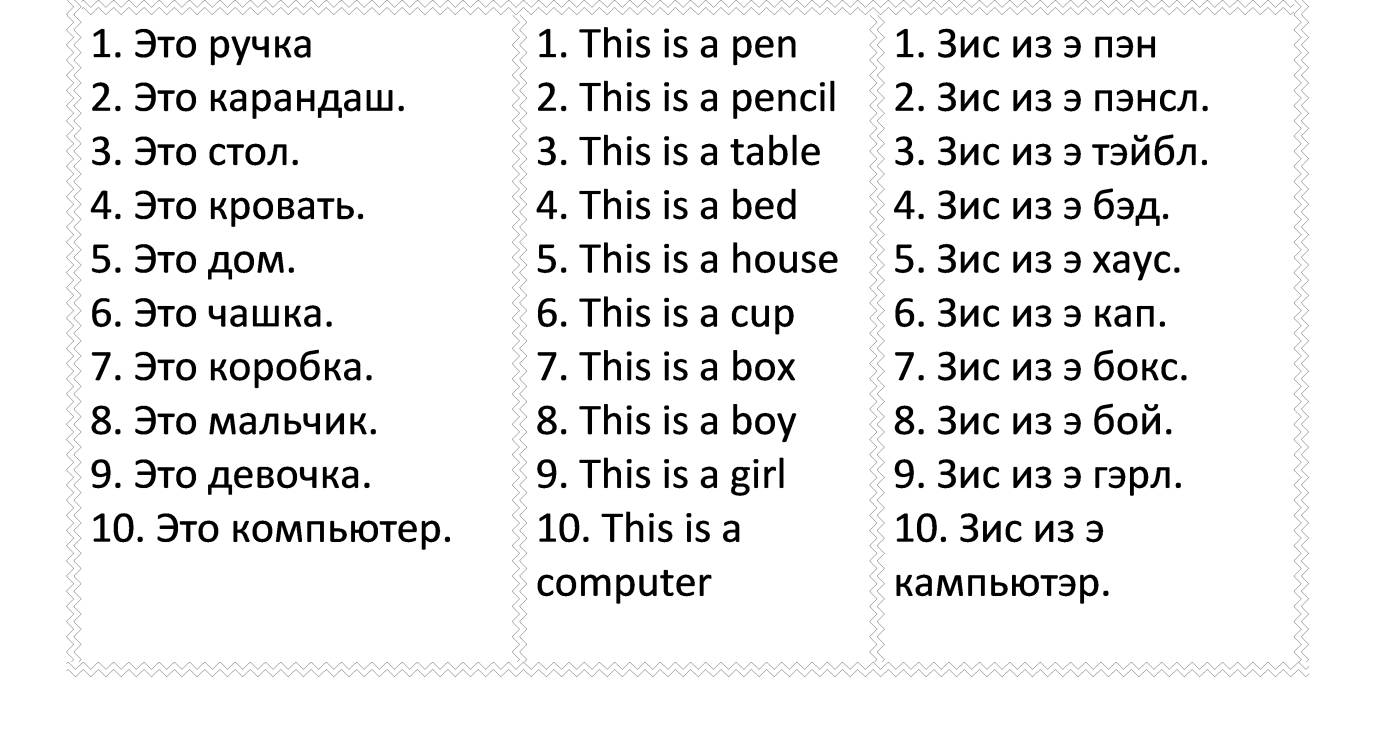 Слева приводятся предложения на русском. Во второй колонке этой таблицы указан перевод этих предложений на английский язык, а в третьей указывается примерное произношение русскими буквами.