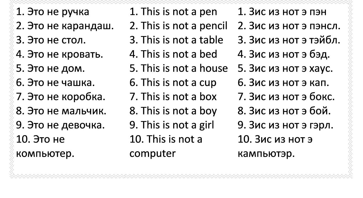 Прикройте рукой последние две колонки и попробуйте самостоятельно перевести предложения из первого столбца с русского на английский. В случае сомнения в правильности перевода, временами можете подсматривать перевод из второй и третьей колонок. Постарайтесь отработать каждое предложение по несколько раз и довести до автоматизма способность воспроизвести любое из приведенных выражений на английском языке.