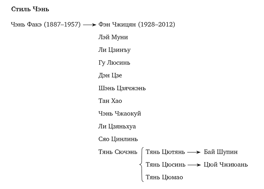 Стиль Чэнь. Стиль Чэнь появился более трехсот лет назад, в конце эпохи Мин – начале Цин. Его основателем считается Чэнь Вантин, представитель девятого поколения семьи Чэнь из деревни Чэньцзягоу уезда Вэньсянь провинции Хэнань. Взяв за основу практики кулачного боя, существовавшие в армии при дворе Мин, он доработал их, соединив с методиками даоинь и туна[20], а также с древней философской концепцией инь-ян и медицинской теорией о меридианах и коллатералях организма. Так появился новый тайцзицюань, объединивший «внешнее» и «внутреннее»[21]. В приписываемом Чэнь Вантину «Собрании речитативов из “Канона о кулачном искусстве”» изложен принцип его стиля: «Я двигаюсь так свободно, что врагу не предугадать; я стараюсь его запутать, чтобы знать, когда нападать». Он также является автором общей характеристики восьми способов применения силы цзинь, характерных исключительно для тайцзицюань (пэн, люй, цзи, ань, цай, ле, чжоу и као)[22]. Базовый принцип боя, которого придерживался Чэнь Вантин, – накрепко примкнуть к противнику и заставить его допустить ошибку – стал известен как самый оригинальный взгляд на методику боевых искусств. Новая методика передавалась семьей Чэнь из поколения в поколение, оставаясь недоступной для посторонних. Так продолжалось до тех пор, пока Чэнь Чансин, представитель четырнадцатого поколения рода Чэнь, не передал накопленные знания Ян Лучаню. Однако стиль Чэнь так и не вышел за пределы глухой деревни Чэньцзягоу.