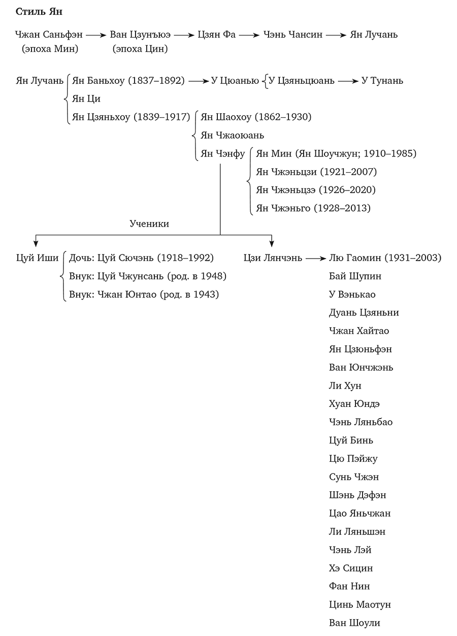 Стиль Ян. Ян Лучань сыграл важную роль в истории развития тайцзицюань. Еще во время обучения боевым искусствам в Хэнани он получил прозвище «Непобедимый Ян». Его главная заслуга заключается в том, что он переработал унаследованную традицию тайцзицюань в собственный стиль, одновременно усилив и оздоровительную, и оборонительную роль упражнений. Это стало сенсацией в мире боевых искусств, начался новый виток развития тайцзицюань. Мастер Ян Лучань прославился тем, что сломал рамки традиционной формы тайцзицюань, осмелился совершить революцию и дать волю творческому порыву, тем самым изменив обычные упражнения. Перебравшись из деревни в столицу, он стал преподавать собственный стиль тайцзицюань широкой аудитории. Так тайцзицюань перебрался через великую реку Янцзы, распространился по всему Китаю и даже вышел за его границы.