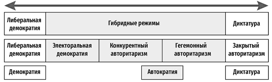 Со временем отклонения становились все более явными, парадигма транзита продолжала свое развитие[18], научное сообщество отреагировало на это тем, что сменило ярлыки для обозначения режимов, при этом никак не переосмыслив саму парадигму. Другими словами, хотя для различных недемократических режимов и придумывались новые названия, лежащий в основе язык описания их характерных черт оставался практически неизменным. Использование новых категорий для различных элементов режима было намного более спонтанным, чем у компаративистов предыдущего поколения[19], и по большому счету никто не ставил перед собой задачу систематически пересмотреть фундаментальные категории и привести их в соответствие с новыми ярлыками.