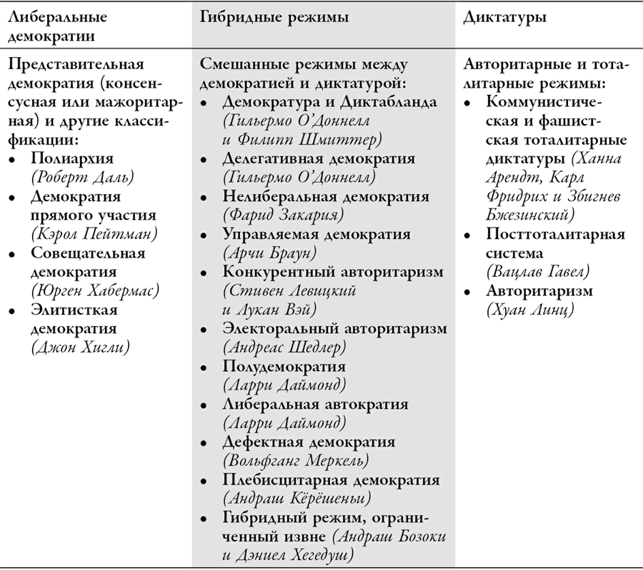 Переработанный материал в хронологическом порядке появления терминов в литературе на основании работы: Bozóki A., Hegedűs D. Democracy, Dictatorship and Hybrid Regimes: Concepts and Approaches // Illiberal and Authoritarian Tendencies in Central, Southeastern and Eastern Europe. Bern: Peter Lang, 2018. P. 21–49