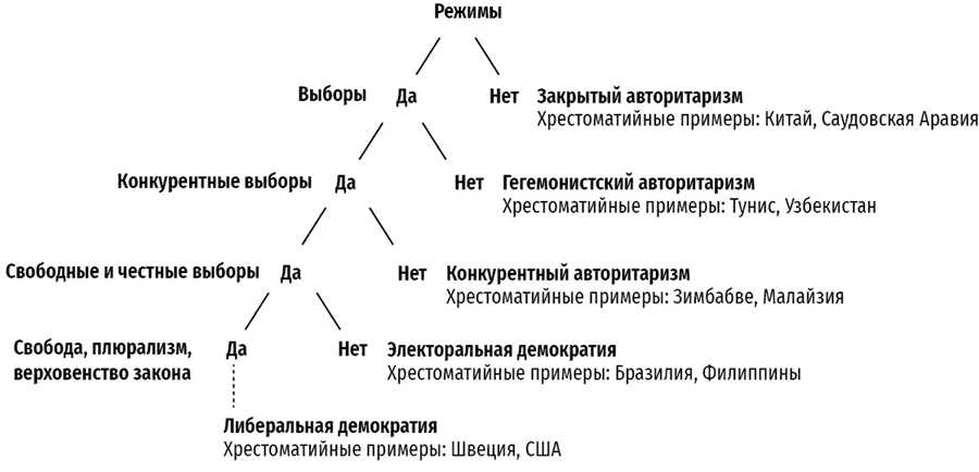 Провал парадигмы линейного транзита от коммунистической диктатуры к либеральной демократии стал очевиден уже через десять лет после смены этих режимов. Некоторые посткоммунистические страны, такие как Эстония, Польша или Венгрия, всего за несколько лет существенно приблизились к либеральным демократиям западного образца, тогда как в посткоммунистических странах, расположенных восточнее, таких как Россия и страны Центральной Азии, демократизация «замерла» или «обратилась вспять» вскоре после начала процесса[23]. Поскольку становилось все сложнее закрывать глаза на разочарование по этому поводу, литература о демократическом транзите обогащалась новыми терминами. Ученые стали создавать для режимов новые ярлыки, которые отражали их недемократический характер.