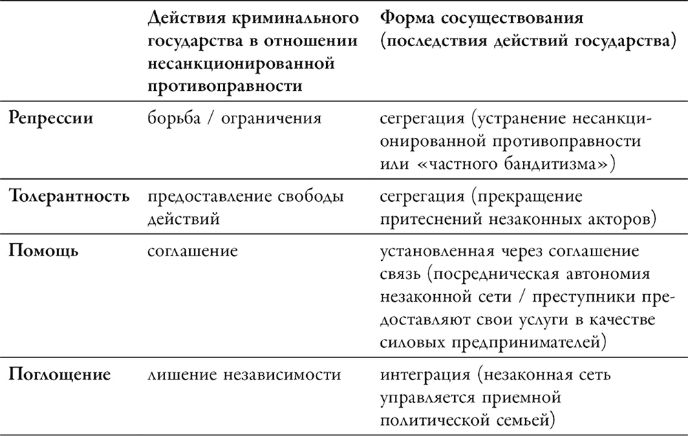 Итак, если подвести итог, то мы можем использовать терминологию Тилли для описания различных форм сосуществования криминального государства и разновидностей несанкционированной противоправности (Таблица 5.4). По его мнению, их можно понять в рамках концептуального пространства, которое охватывает три идеальных типа отношений: (1) сегрегация незаконных элементов от публичной сферы (например, когда государство относится к ним враждебно); (2) установленная через соглашение связь между незаконными элементами и публичной сферой (например, в случае посреднической автономии); и (3) интеграция незаконных элементов в публичную сферу[112]. В случае некриминального государства интеграция означала бы, что акторы, прибегающие к несанкционированной противоправности, то есть к любой незаконной деятельности, теперь признаются законом. В криминальном государстве интеграция означает поглощение либо ситуацию, когда незаконная сеть остается таковой, но в дальнейшем ею управляет приемная политическая семья.