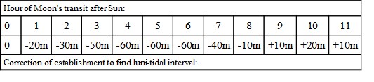 Thus at a port where the establishment was 3h. 25m., let us suppose that the transit of the moon took place at 6 P.M.; then we correct the establishment by -60m., and find the luni-tidal interval to be 2h. 25m., and accordingly the high water takes place at 8h. 25m. P.M.