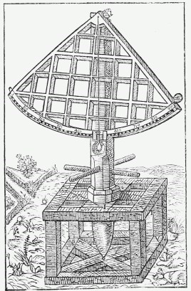 His next advance in instrumental equipment was to provide himself with the contrivance known as the "cross-staff," which he used to observe the stars whenever opportunity offered. It must, of course, be remembered that in those days there were no telescopes. In the absence of optical aid, such as lenses afford the modern observers, astronomers had to rely on mechanical appliances alone to measure the places of the stars. Of such appliances, perhaps the most ingenious was one known before Tycho's time, which we have represented in the adjoining figure.