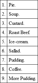 Guest's will kindly not contradict or make fun of their host, since he is very irritable and does not like to be contradicted or made fun of. Guests will oblige their host by not asking for anything that is not on the bill of fare. In a private house like this it would be very awkward to have to serve guests with fried potatoes at a time when ice-cream or mince pie has been ordered.