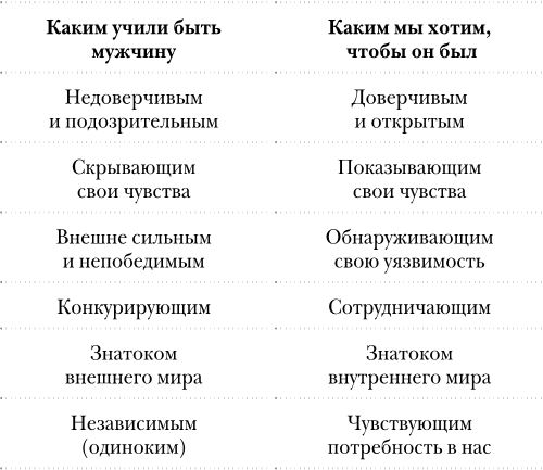 Мы ожидаем от мужчин компетентности в тех вопросах, которые для них абсолютно неведомы и в которых женщины, как правило, прекрасно разбираются, – в способности выражать эмоции, быть чувствительными, тактичными, в умении любить.